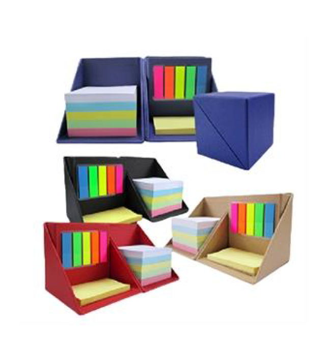 Descripción: cubo ecológico, 500 hojas notas 5c, 50 hojas de notas adhesivas amarillas, 25 hojas 5c banderas adhesivas.